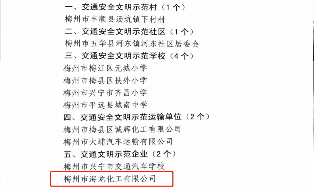 海龍化工積極響應交通安全文明要求,自公司成立以來,深耕文明交通行動領域,致力于建設安全文明、和諧有序的道路交通環(huán)境工作,為營造文明和諧的城市環(huán)境貢獻力量。公司始終貫徹“安全第一,預防為主”的安全工作方針,注重交通安全文明建設,通過加強教育、健全制度,強化監(jiān)督等措施,把交通安全作為公司安全生產(chǎn)中重要的一環(huán),認真貫徹落實,嚴格遵守交通法律法規(guī),實現(xiàn)了自公司成立以來無重大交通事故發(fā)生、無人員人身傷亡的目標,確保了生產(chǎn)經(jīng)營的正常運轉(zhuǎn)。